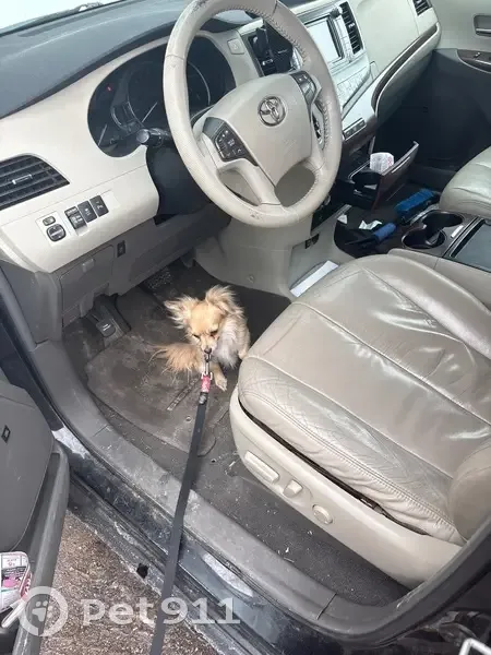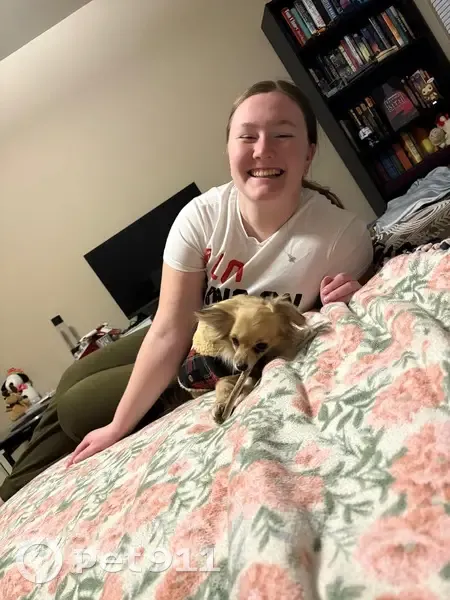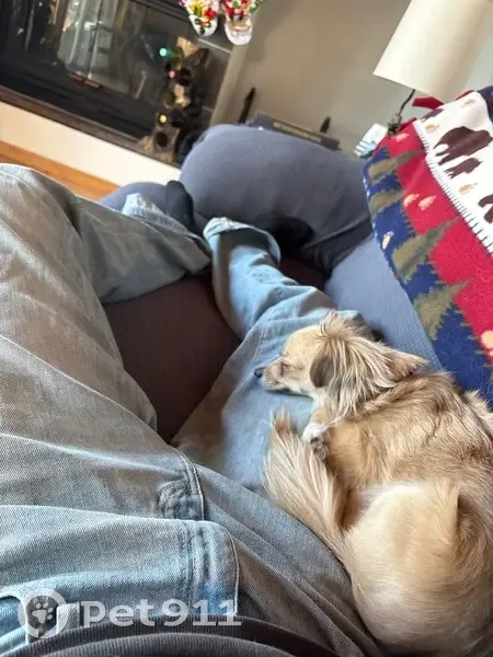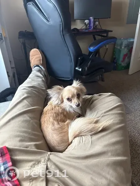 He’s a tan , 5lb long hair chihuahua. He’s very timid and skittish, and will run if you chase him. He should be wearing a red and black jacket and has a leash on.