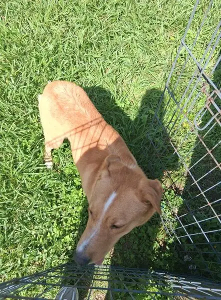 Appa is light brown and has a white mark on his nose along with a white line down his face. He also has two white marks on his back below his neck he has a green collar on along with his leash that is grey I was walking Appa and we are crossing the street and we had to stop in the middle to Let the other cars come and a truck passed by and it’s honked it’s corn and it startled him and he ran, and from that point after he ran, his leash scared him even more so he continued to run and read into the woods behind waffle House