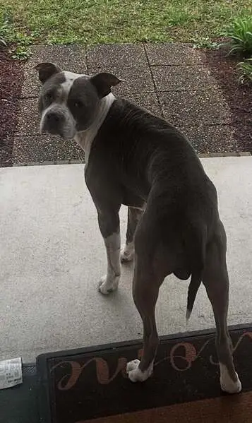 There was a vehicle accident on 1417 near the mosque and she ran off scared. She is wearing a gray collar with a green reflective bone collar and a service dog tag.