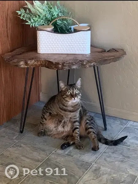 Our furry baby is a Bengal tabby mix with orange tummy. He has a dark spot in his right eye. He was not wearing a collar. Exceptionally friendly and outgoing. Besides his name, he also really responds to "comida" (FOOD in Spanish).
