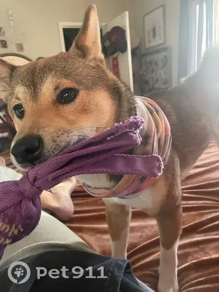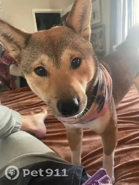 Red sesame Shiba Inu white paws, curly tail, white chest looks like a Fox He’s wearing a blue harness and blue leash. He ran out of my office and took off. He’s very quick, but good motivated.