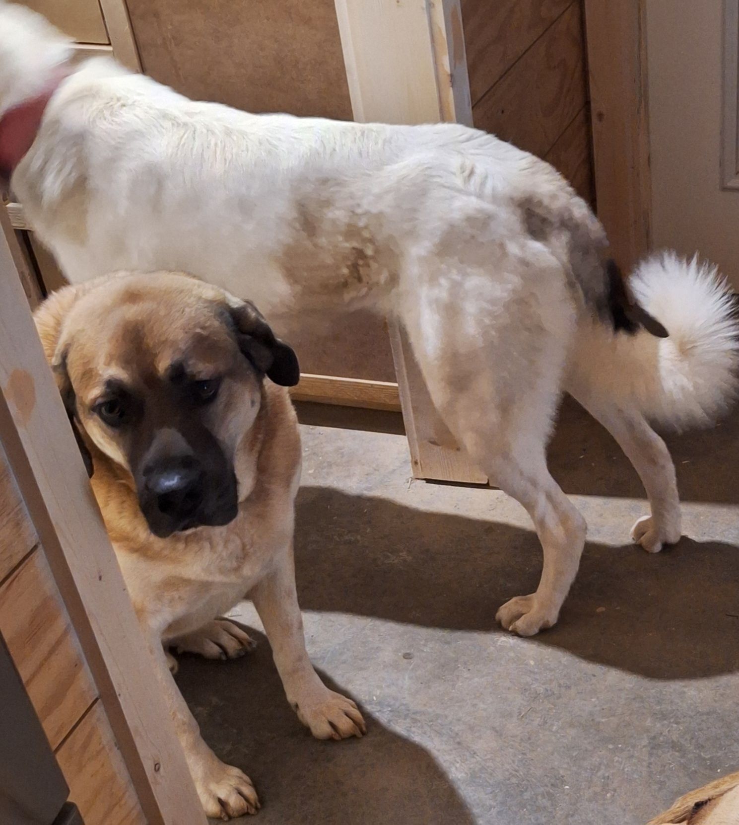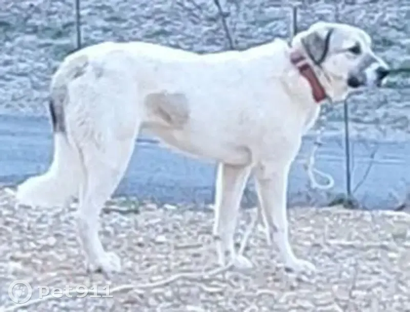 White with tan spots on each side . Right side tan at the waist. Left side tan at the waste and under the collar at shoulder. Dark ears. Top half of tail is tan with black in the center. Black and white around her muzzle. Approximately 60-70lbs, juvenile large breed Anatolian Shepherd. Thick red collar, light blue leash attached at time of disappearance. We were taking her and our other dogs to the vet (location address) and she slipped out while unloading the dogs and ran away.