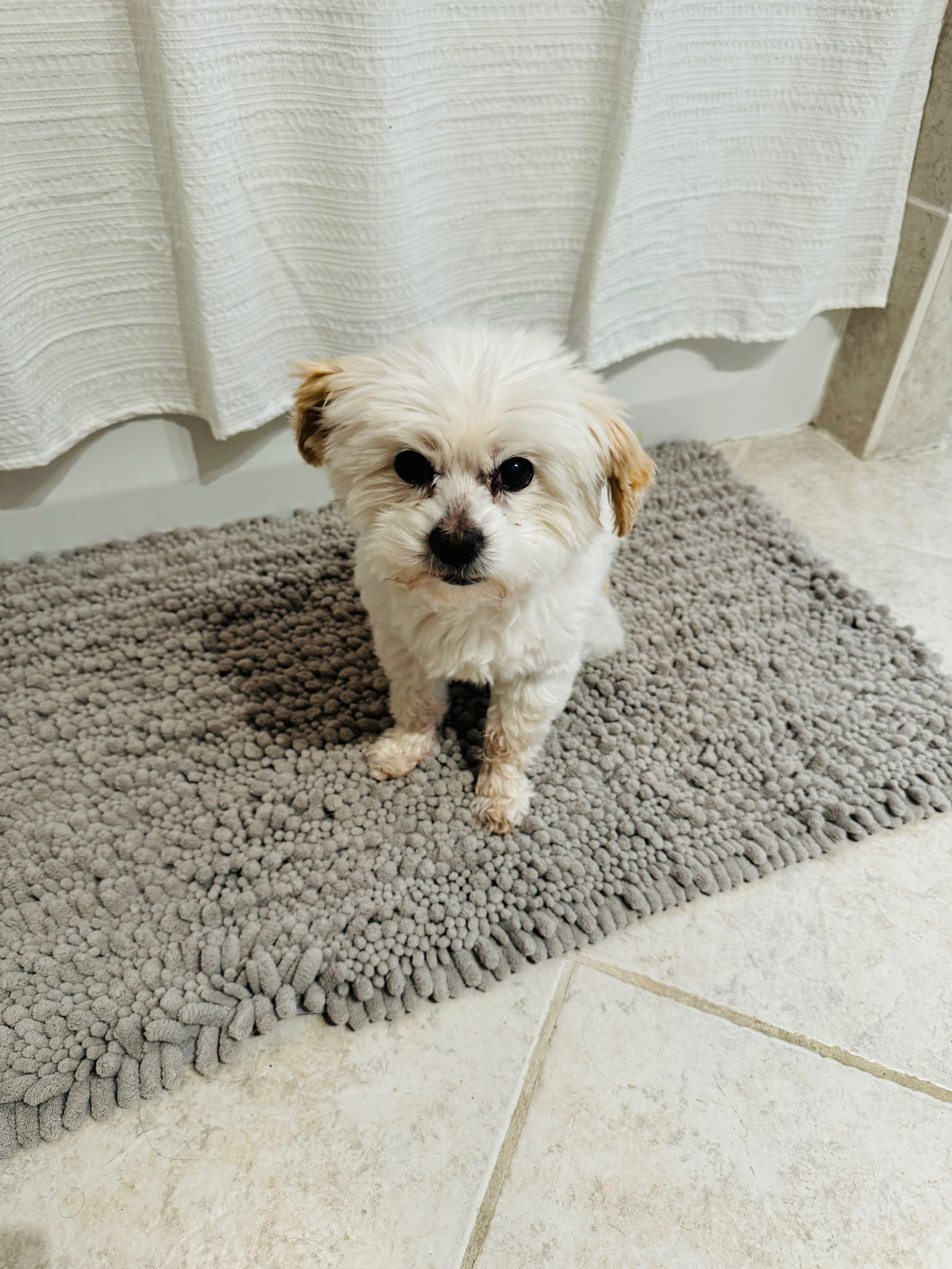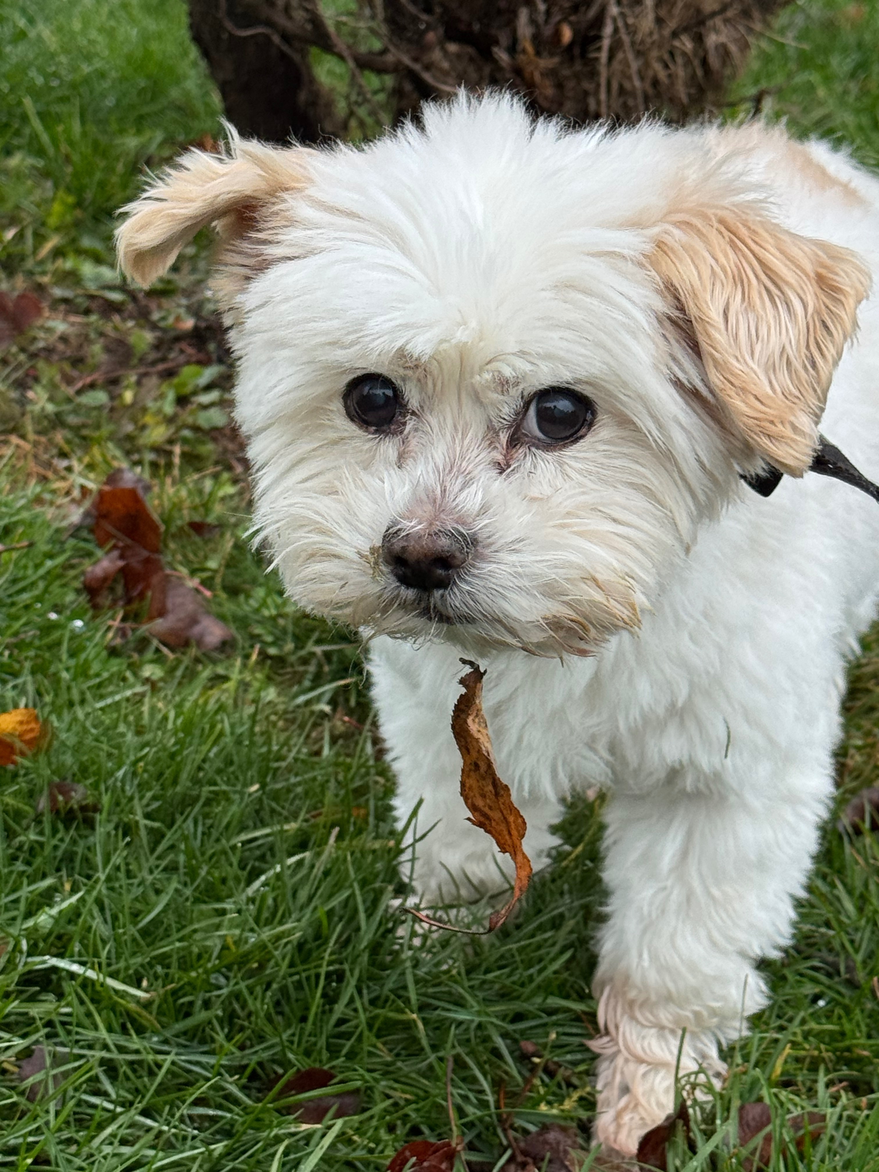 White, few light tan spots, wearing a male wrap (diaper). Sal is slightly vision impaired and hearing impaired as he is 20yrs old. Early dog dementia as well. He is in cogestive heart failure and takes daily heart meds/lasix. I was at work and my son got to my house and said front door was slightly ajar (I assume from not being completely latched shut which is odd) and Sal was only of three animals not in the house, and got out sometime between 4-6:30pm. He doesnt like the snow or the cold! Very strange for him. No collar on, no tags! Not microchipped! Blue haze in eyes from cataracts!