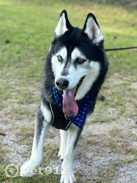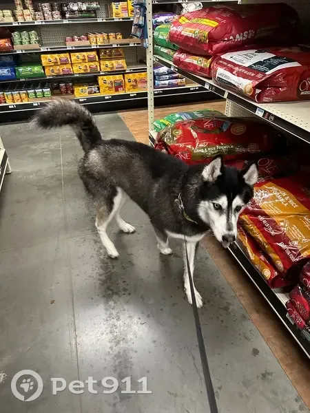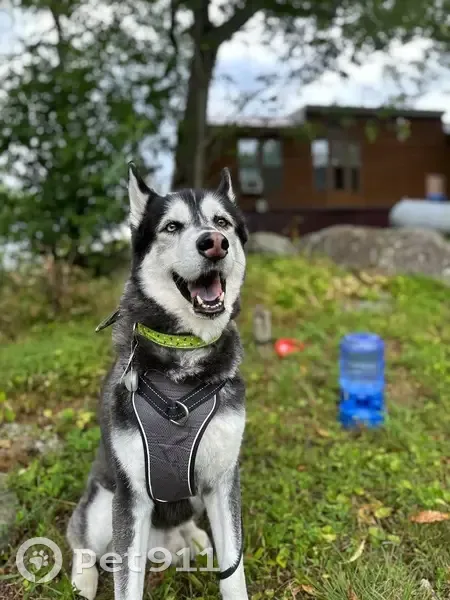 Husky Male black and white fur with brown on hock. Milo ran off when the fence door was left open early morning. Milo walks around with his tail up, he was wearing a green, sailor patterned collar.