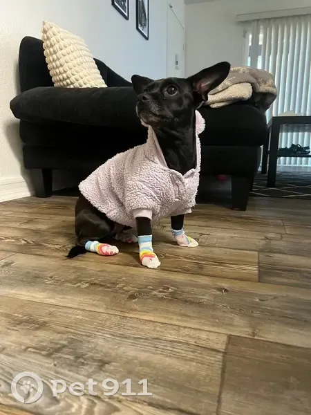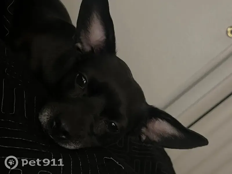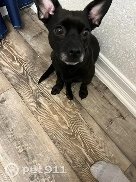 She has short black hair a white chin. She is microchipped. She’s a sweetheart she’s really scared so she may try biting. She’s going be hungry and thirsty she would warm up quickly with food.