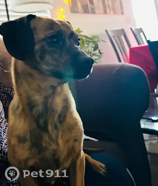 Dachshund/possible mix, brindle color, younger, no collar or apparent chip, thin (ribs showing), timid but warms up pretty quickly. Affectionate, but not house trained.
