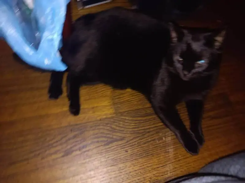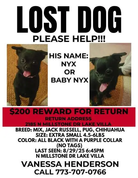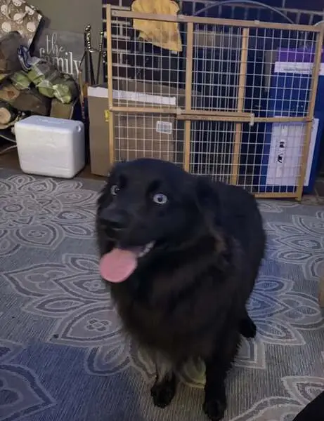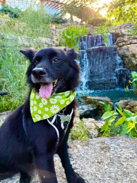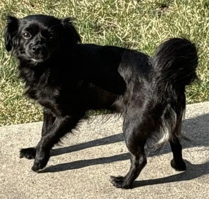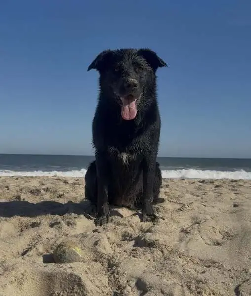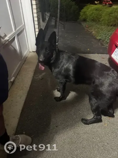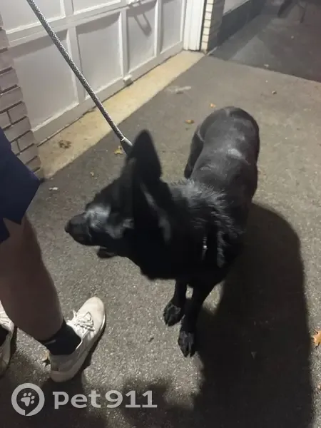 Large black female dog. Looks similar to a German Sheppard. She has a silver chain collar and a silver chain necklace. She is friendly and very energetic.