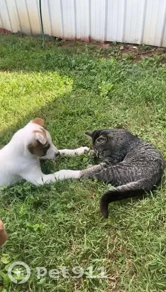 Shes white with brown patches on her face. Shes very friendly and knows to come if you say it. She doesn't wear collars because she freaks out when I put one on. Around 7:30 she went missing, I heard a screech while I was cooking and thought she was hit but there was no sign of her at all, I assume someone thought she was stray and picked her up