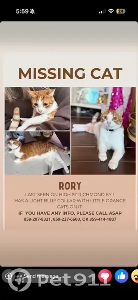 ️ MISSING CAT – RORY ️ Our sweet girl Rory is missing. We haven’t seen her since Thursday in Richmond on High Street and we are so worried. She has five humans and two other kitties that love her so much—we just want her home. Orange with a white belly & white paws Wearing a light blue collar with little orange cats She’s pretty skittish and probably won’t come up to strangers, but she may stay nearby if you shake treats or call for her. She is so, so missed and we’re heartbroken. Please be on the lookout—any information helps. PLEASE call or text ASAP if you see her: (859) 414-1807 (859) 237-6600 (859) 287-8331