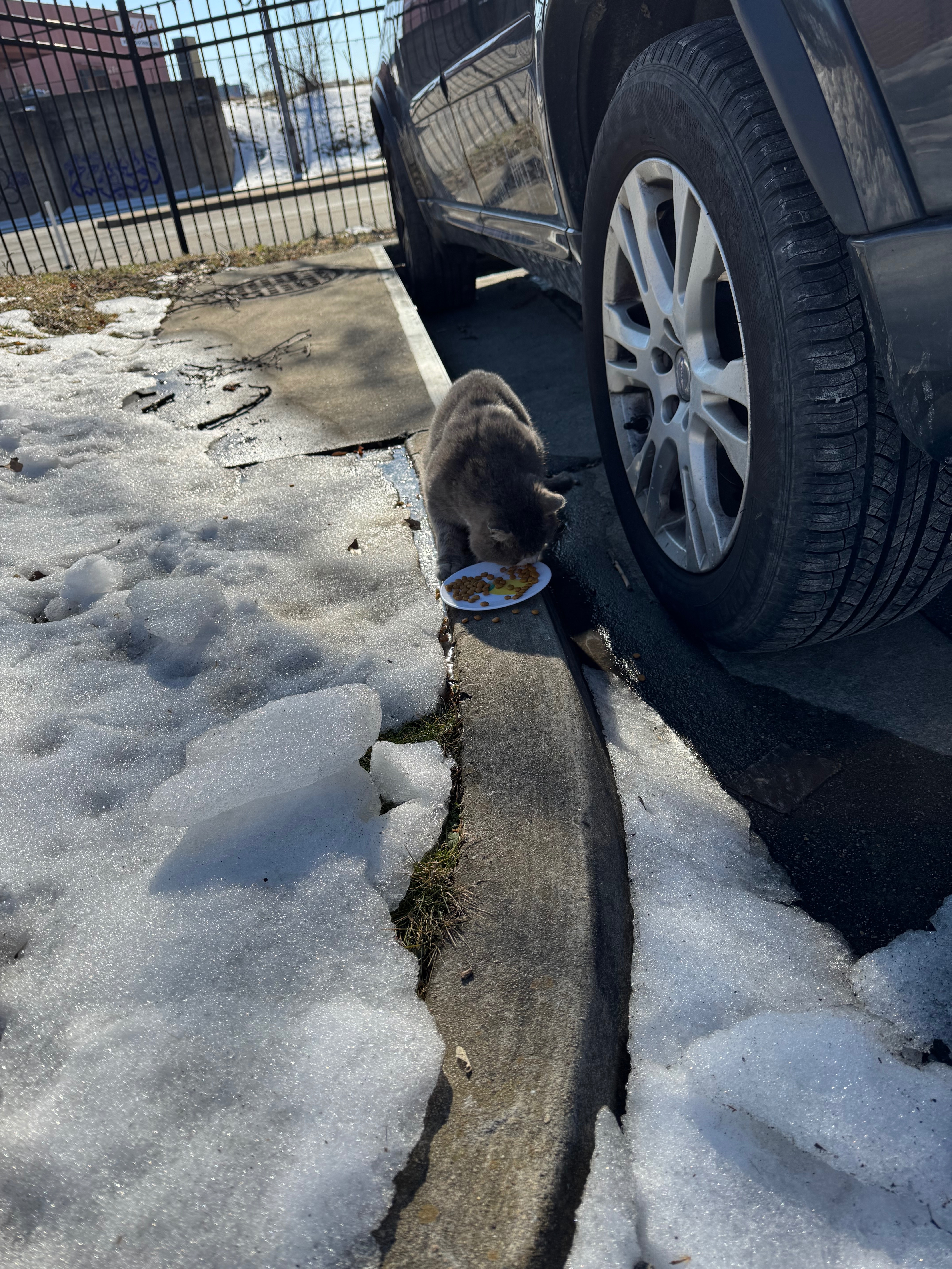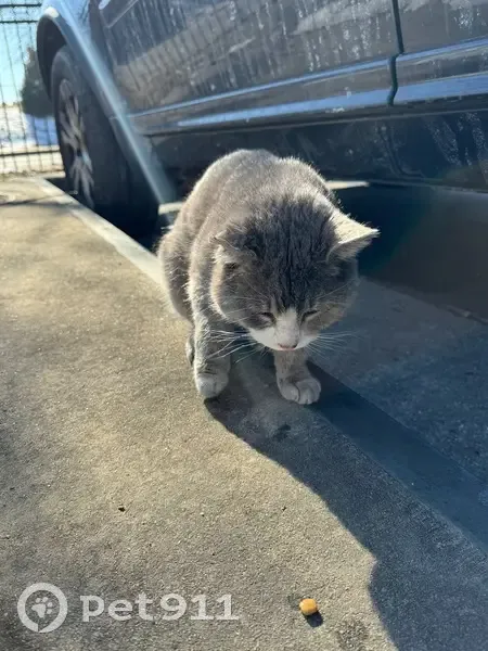 Grey tabby with white belly, right front paw seems a little sore. Very friendly with humans and let me feed and pet. Will be putting out fresh water and food