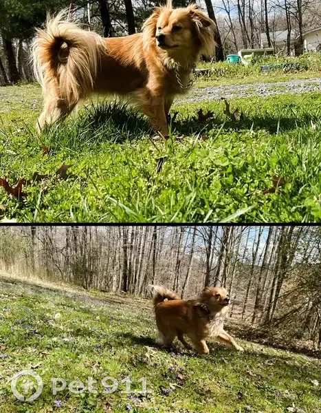 Pitbull mix large dog, about 70 lbs, brown and white. He’s very friendly but may be skittish if he’s chased. He should be with a Pomeranian mix named Bear. Bear is a Pomeranian mix, about 30 lbs, orangey brown and white. He’s wearing an orange and white collar with a bow tie. Secondary number 804-659-3206