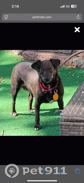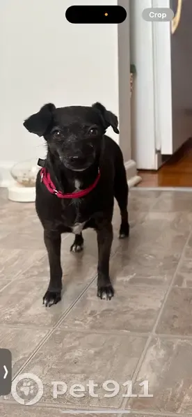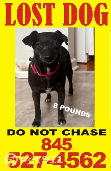 Black/Dark Brown Chihuahua mix, 3/4 years old, 8-10 lbs. She is wearing a red collar that has a golden pendant on it. She is a recently adopted rescue, she is very scared and will run. She does not respond well to her name. Please do not chase if you see her, and alert me in the area you saw her!