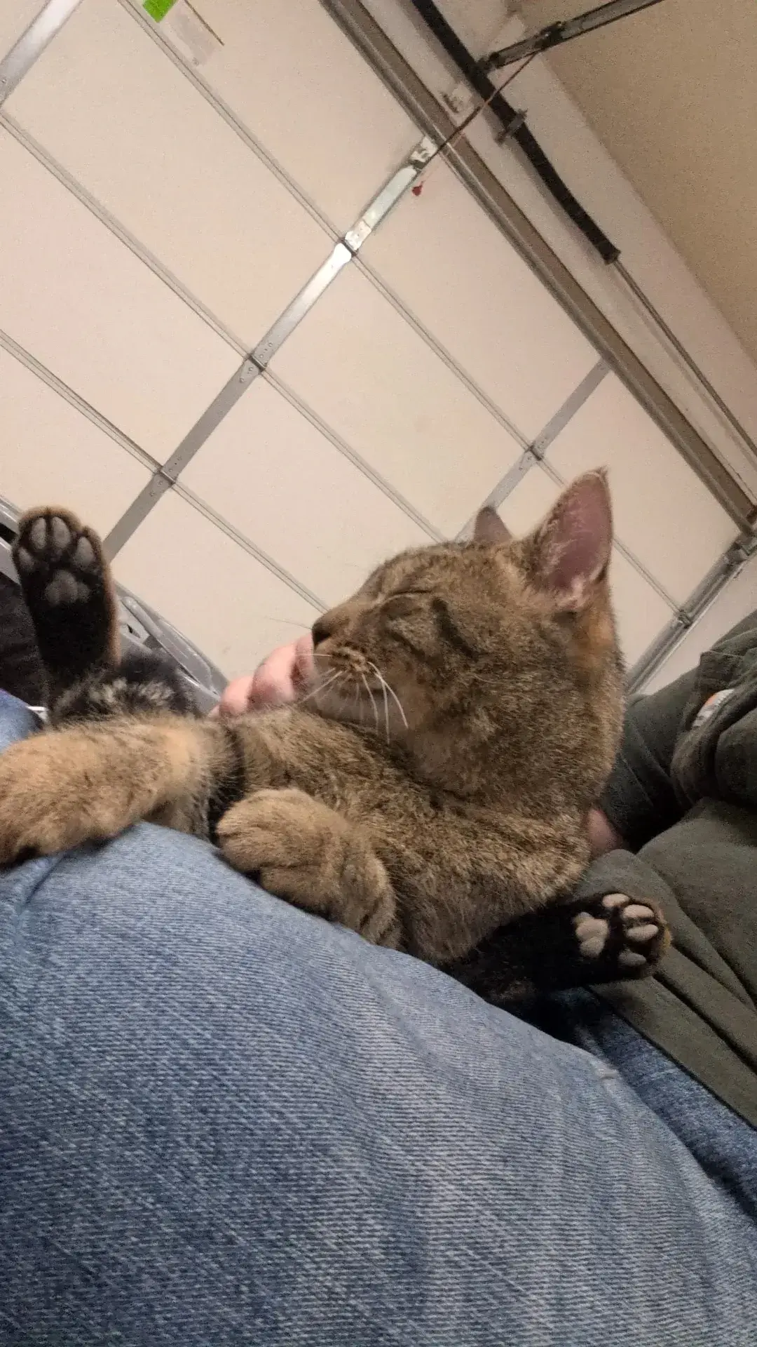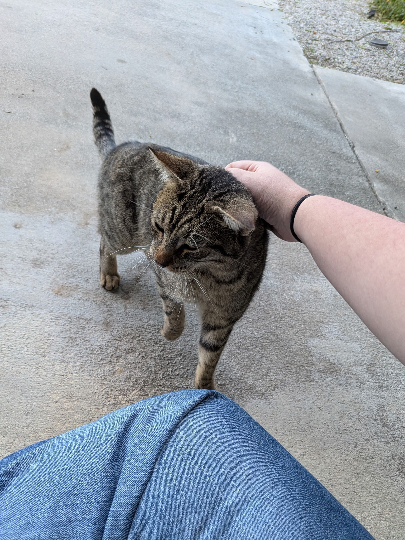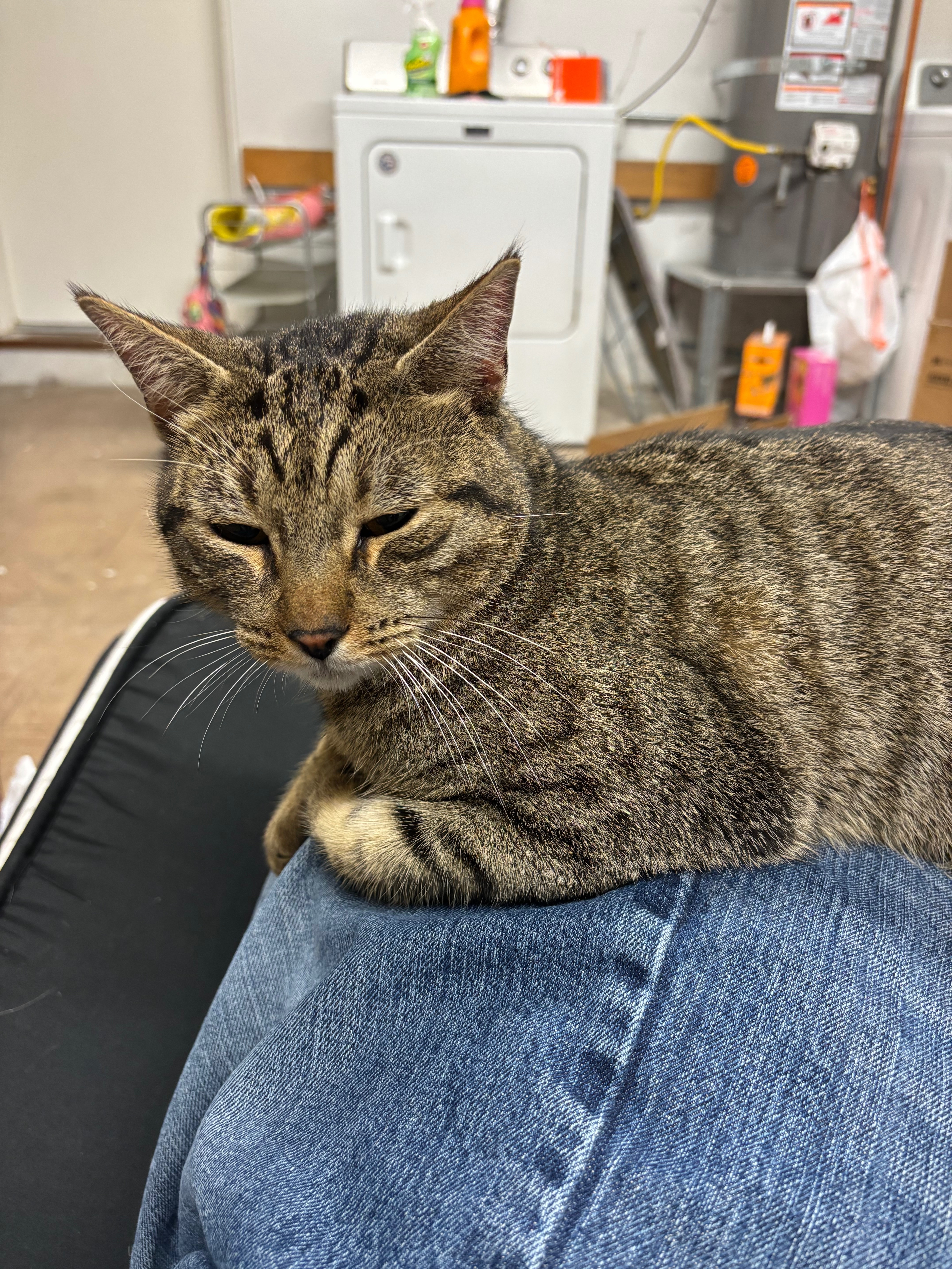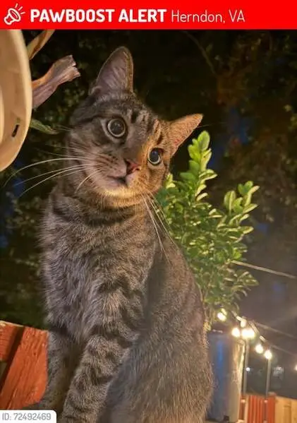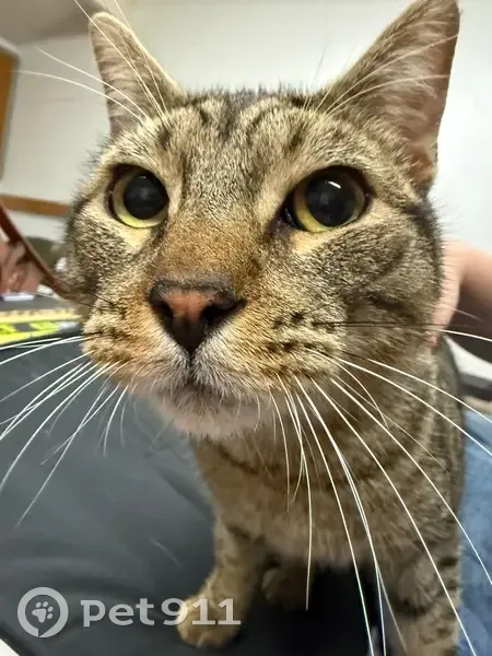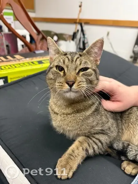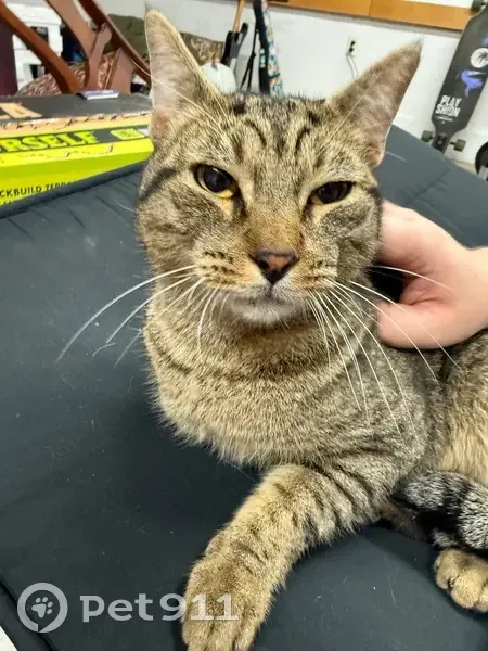 Extremely friendly and sweet cat! Has a kink in his tail, no clipped ear or tattoo, however we think he is neutered. Back of his hind legs and paws are black and he has amber eyes.