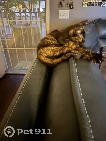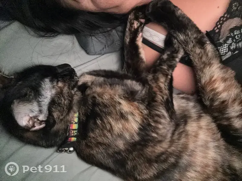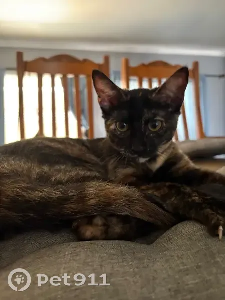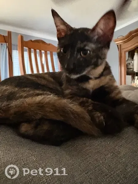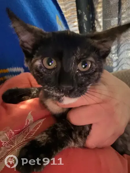 7 month old Female Tortie Mostly black with visible orange tabby markings. Last seen wearing her Red/Green/Yellow collar with bell. She escaped outside while my brother in law was entering our home 10/30/25 and hasn’t been seen since.
