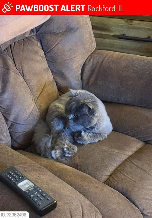 Grey cat, must be scared but is sweet, he is strictly an indoor cat and must've slipped out of the garage, we believe he may be out front, but we also have a HUGE field behind us, leaving us with a huge area to search