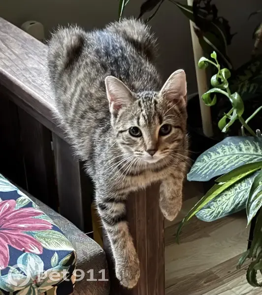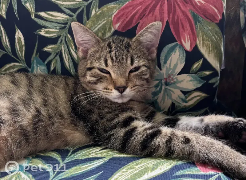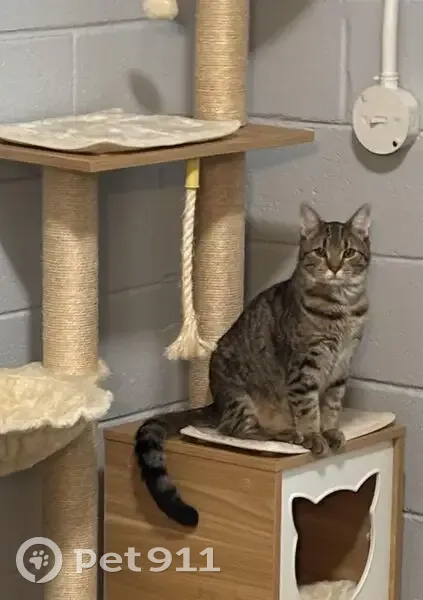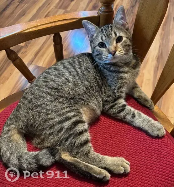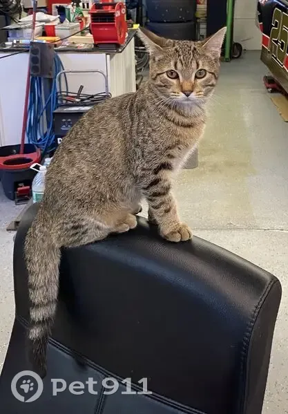 Brown and black striped with a small patch of white around his mouth and under his chin. He is not wearing a collar, and he is not microchipped. He is 8 months old and weighs 8 - 10 pounds. He is an indoor / outdoor cat. The last time we saw him he was playing around our garage. He didn't return to the house. He went missing from our home on November 8.