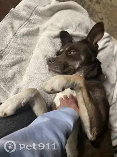 Large male; mostly brown with white feet and chest; eyes light green; wearing large black/gray collar with no tags; gentle and affectionate; found scavenging for food in 7brew parking lot in the rain -- skittish, slightly underweight