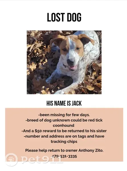 Brown and white possibly red healer mix has a blue tractor supply collar with my phone number on it and a camouflage tag. His name is Jack, and he's a really sweet boy. As a sister at home, waiting for him. They were found together, and this is the longest they've been apart