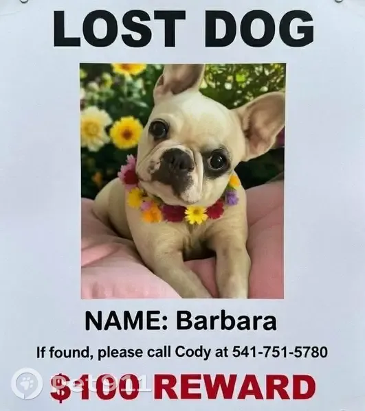 White French bulldog with a little black around her eye and some brown spots wearing a pink collar with a tag might not have the collar anymore. Someone is trying to sell her. We have word.