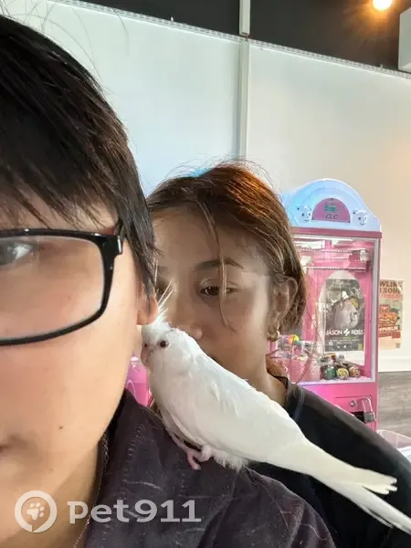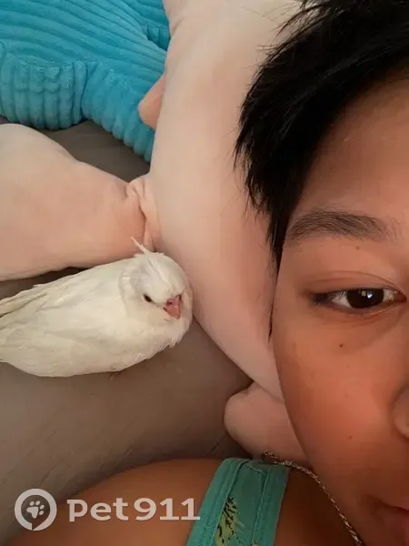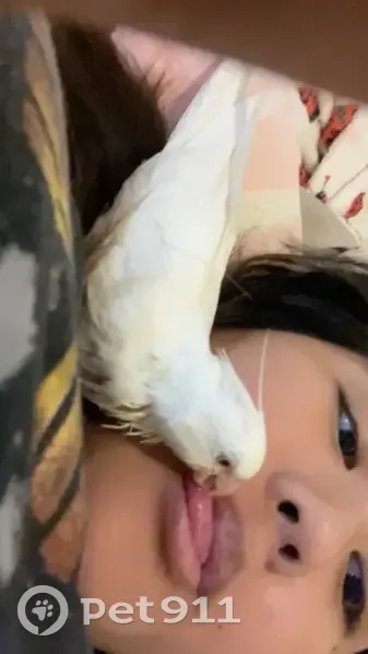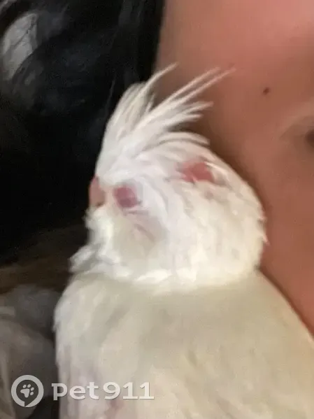 All white cockatiel with a bald spot on his head. Pink/redish eyes and about 5 months old not fully grown yet. Flies in circles and has a hard time landing. Knows his name so yell Binky!!