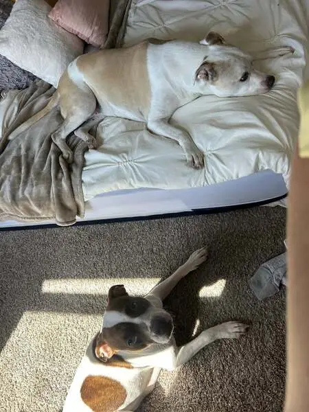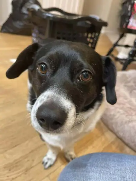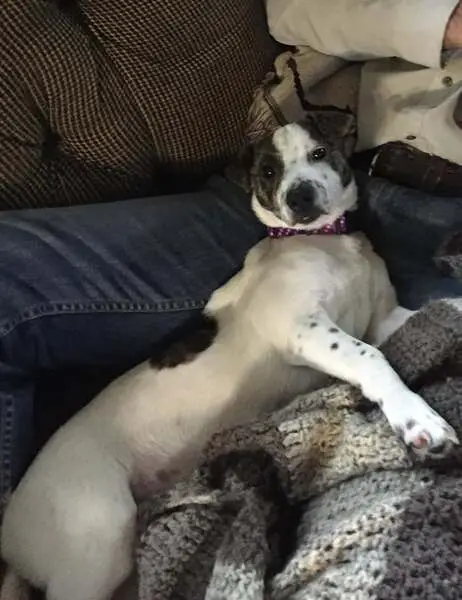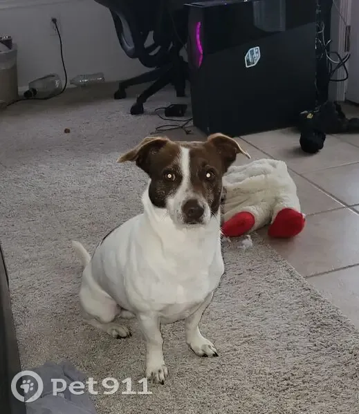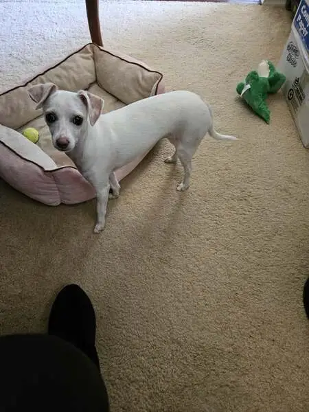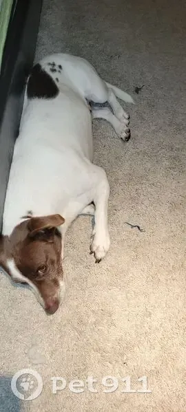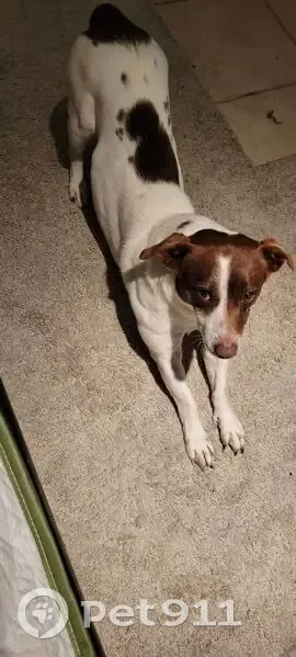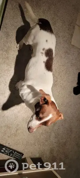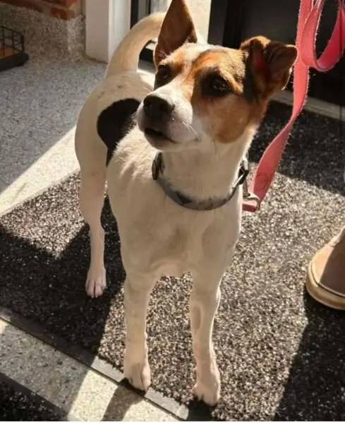 He has a white coat with brown spots. He's very nervous and whines a lot but is super sweet and loves being petted. He's about 3-5 years old I would say and is a small dog, a terrier of some sort.