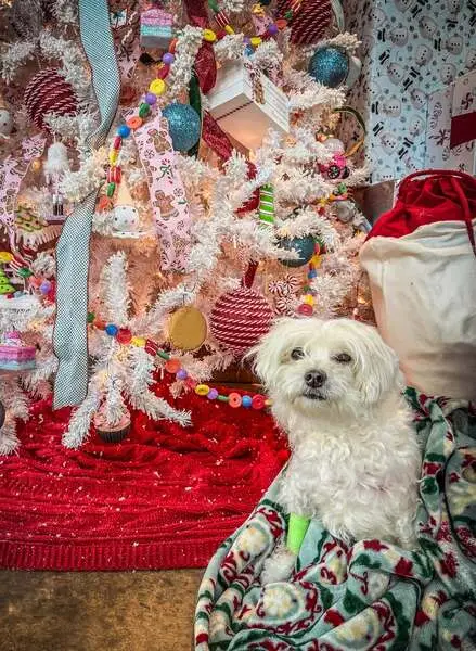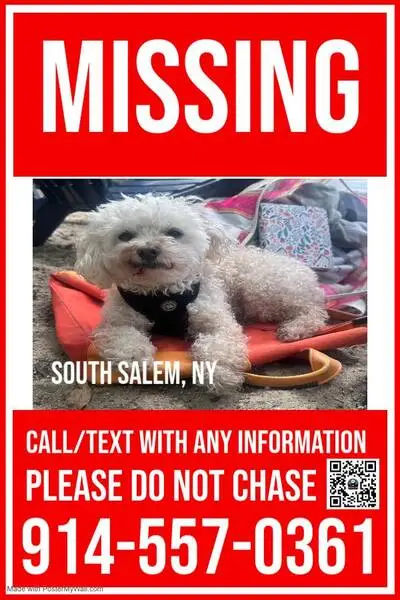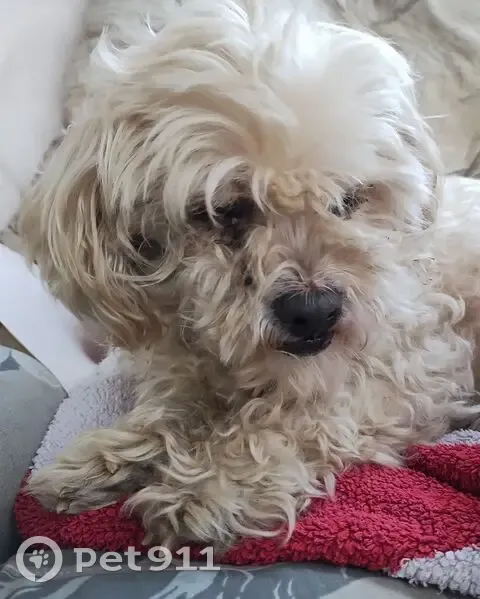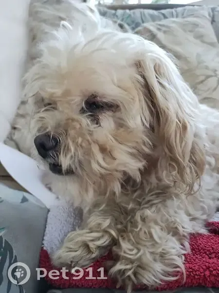 Small poodle with longer fur on head, appears well fed, no fleas, possible cataracts. Maybe 10 lbs. She hopped up onto my porch and onto a chair, so she has moves. I found her about 8am, but I think she was here early, as early as 6am.