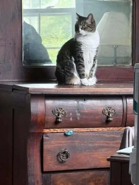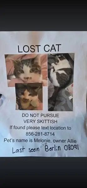 The cat had a white underbelly and white front and back paws. The fur is a medium brownish greyish color with some stripes. The cat has big green eyes. I was at the Salem Oregon Riverfront Park (the one with the carousel) the night of 10/21/2025 and I saw the cat walking. I called it to me and it was very friendly and affectionate and appeared clean and healthy but cold. I have a video of the cat that could help better identify it as the picture I provided is a screenshot of the cat from that video.