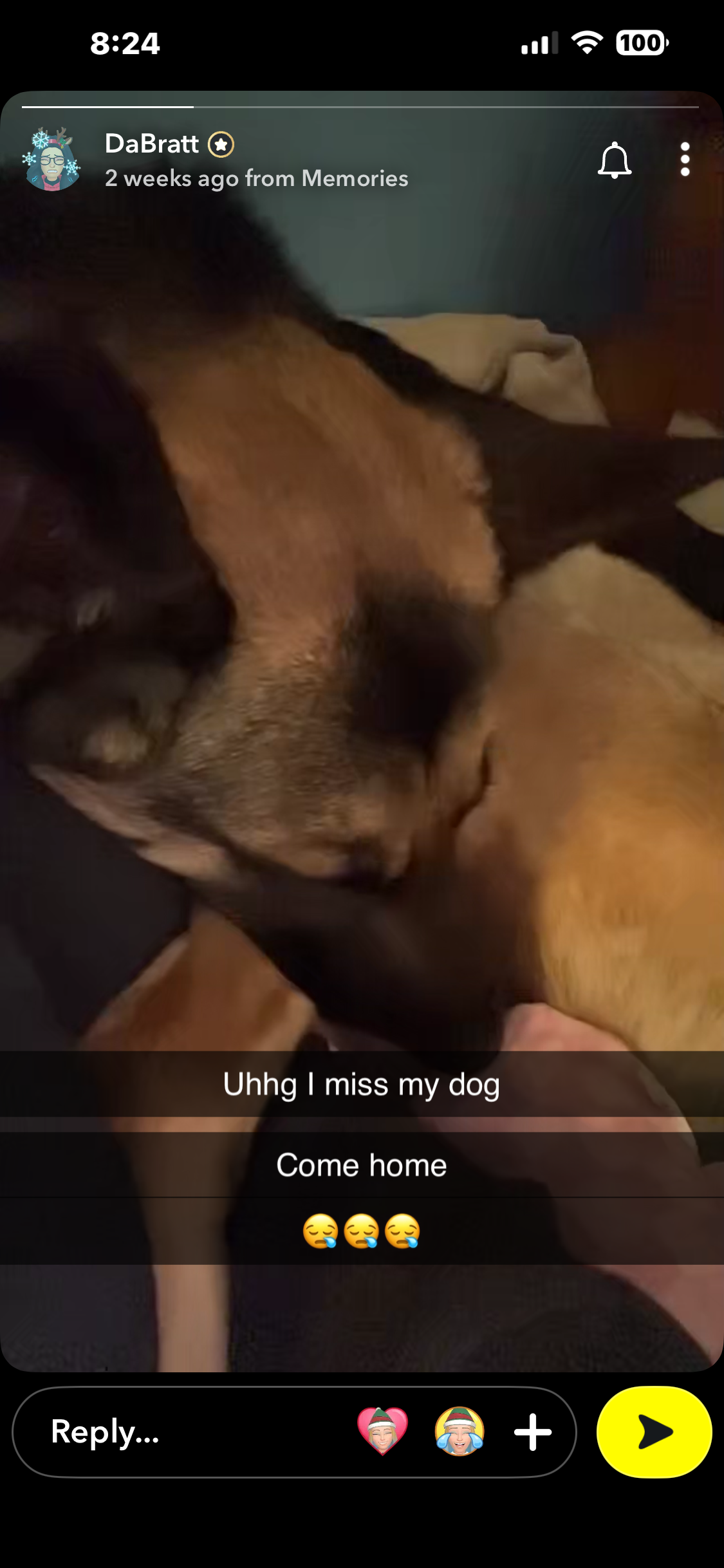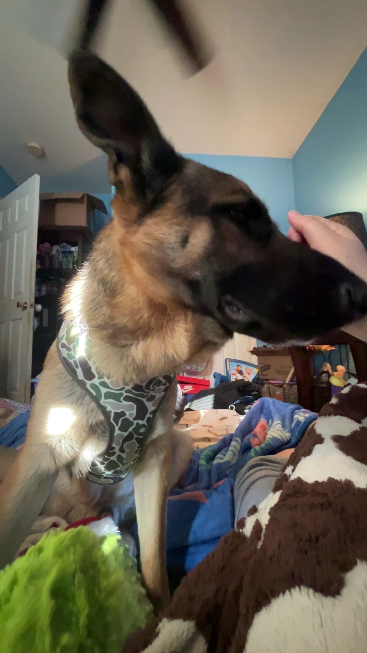 He is black and brown he is skiddish and loves loves attention he had a red shock collar on and a orange and camo harness as in the pictures