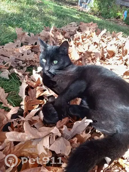 Pig is an all black short hair, with a small section of white on his underside. He has green eyes and wears no collar. He's an outdoor cat, but only moved into this house about a month ago, and slipped out accidentally.