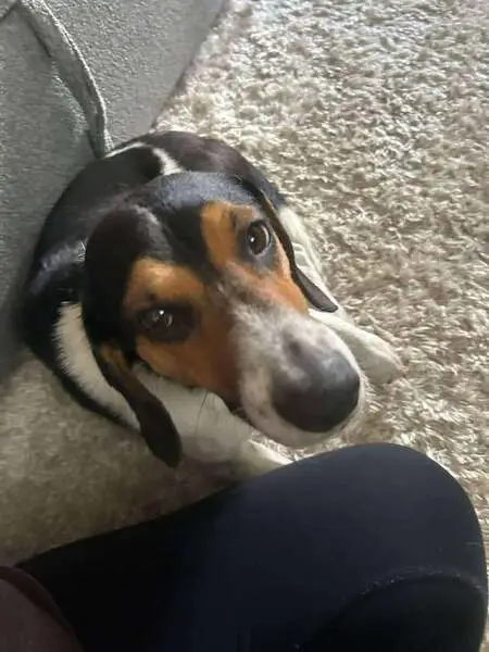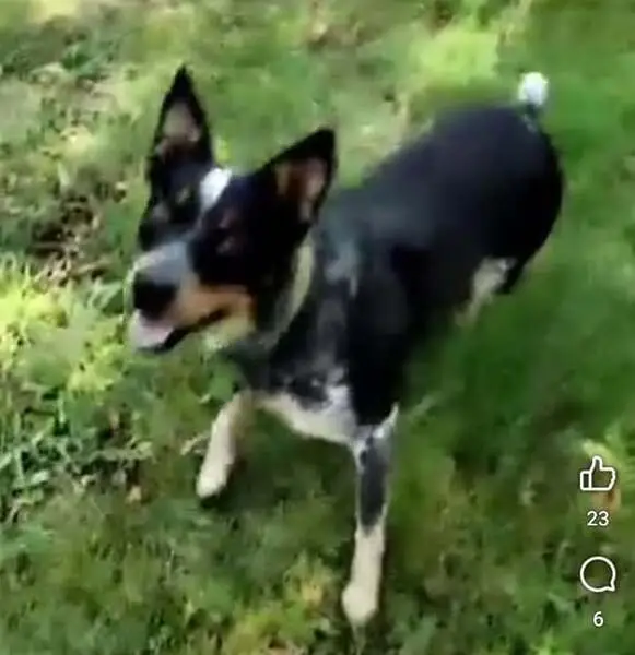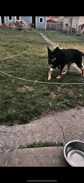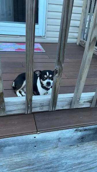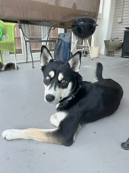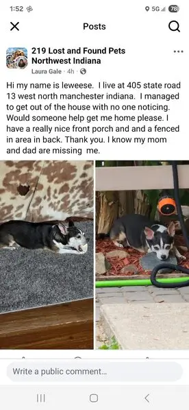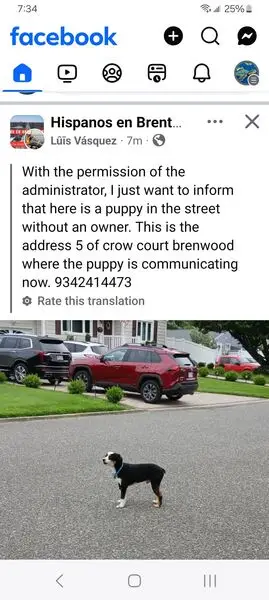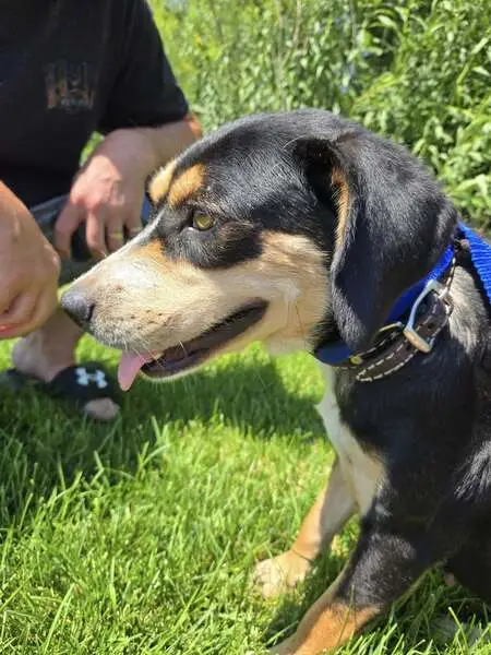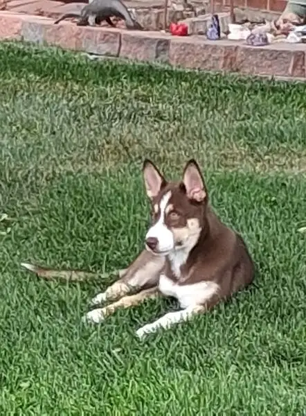 Brown, tan and white colored coat, short hair, male, medium size, husky mix, appears to be still a puppy. Dog was wandering around the neighborhood. Friendly, and not afraid to be on a leash.