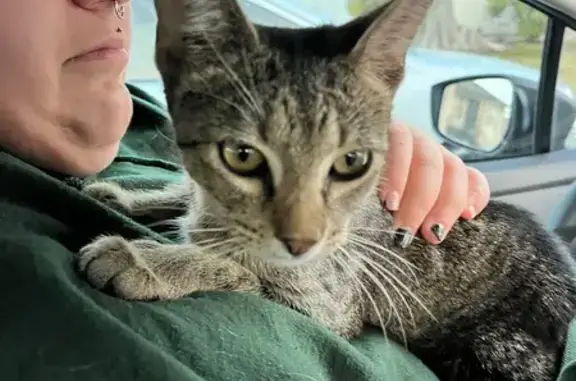 Escaped carrier at Rigsby veterinary clinic and ran to parking lot then proceeded to run towards a field behind the clinic and jumped the fence onto someone's backyard in the neighborhood. Slender and distinctive black swirl pattern on his tummy and has a small rip/tear on side of one ear. Will run if chased. Comes to me when called but not sure if he'll come to strangers.