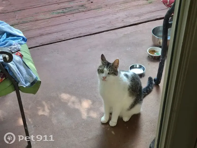 He is grey/white tabby. He is large but not fat. He had big pointy ears with a heart shape face. His fur coat is more white than grey. He is friendly to people but not with other cats. Fixed and microchipped. He lives at Finesilver Ranch sub off Braun Rd/Tezel rd.