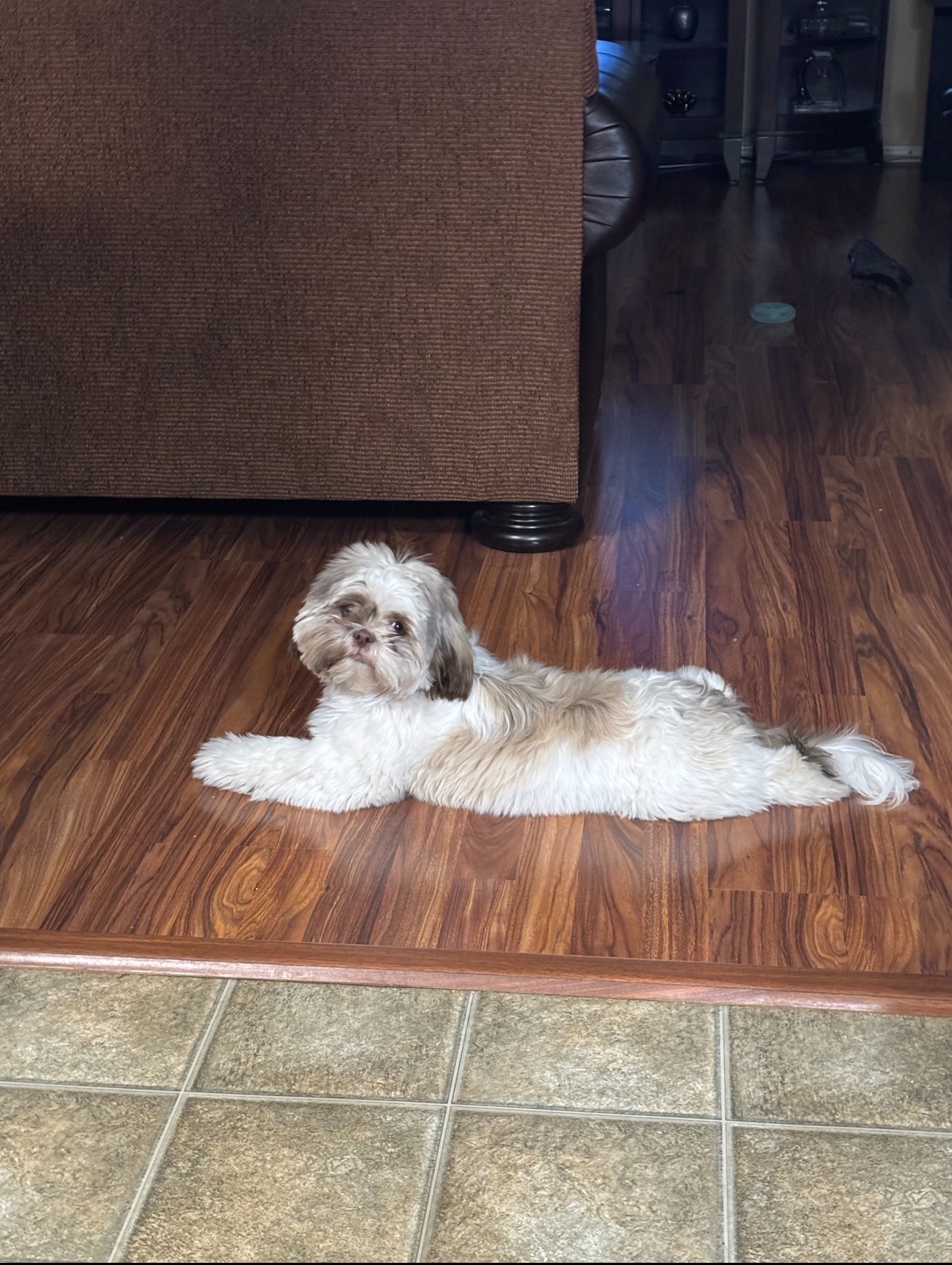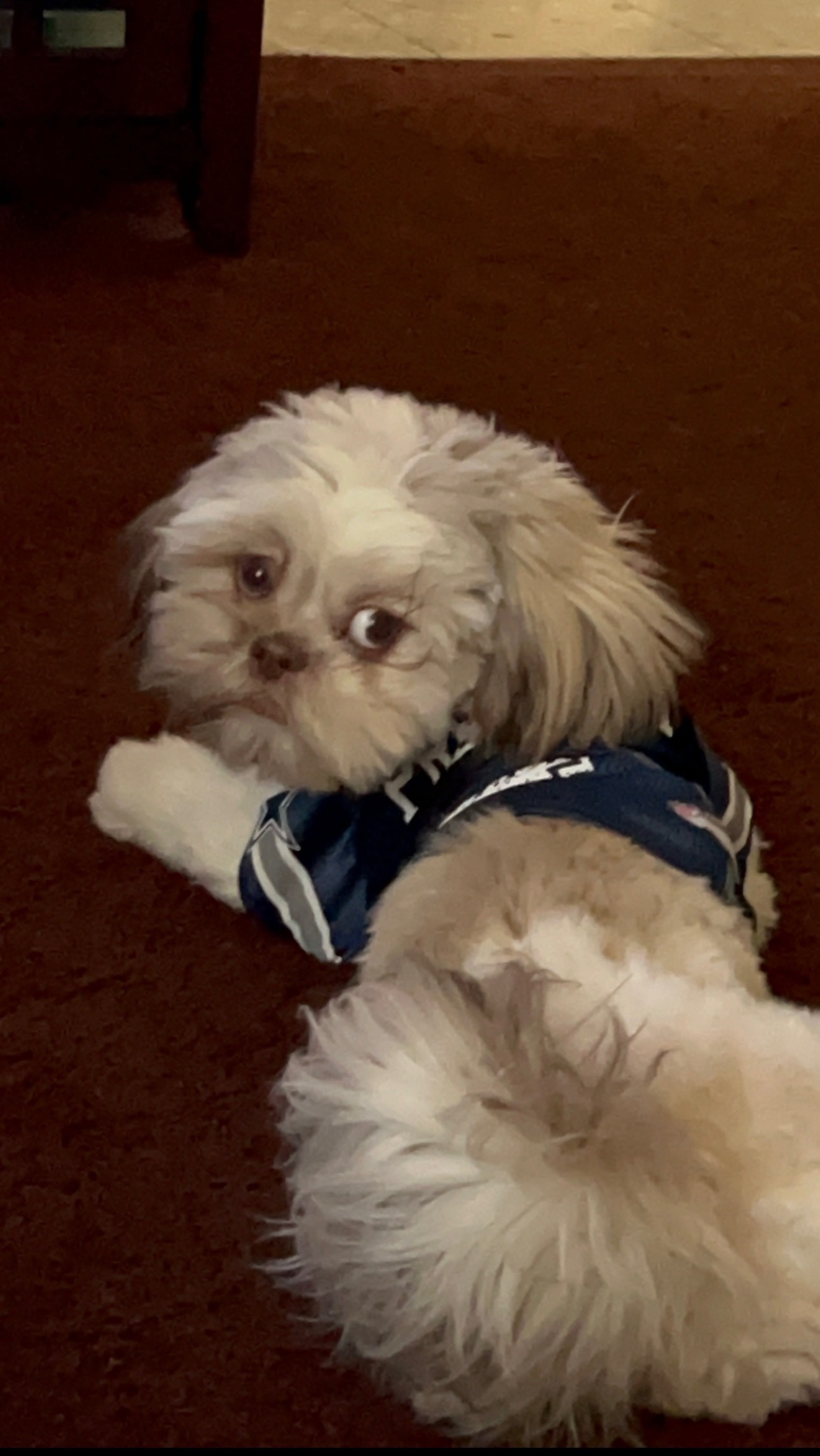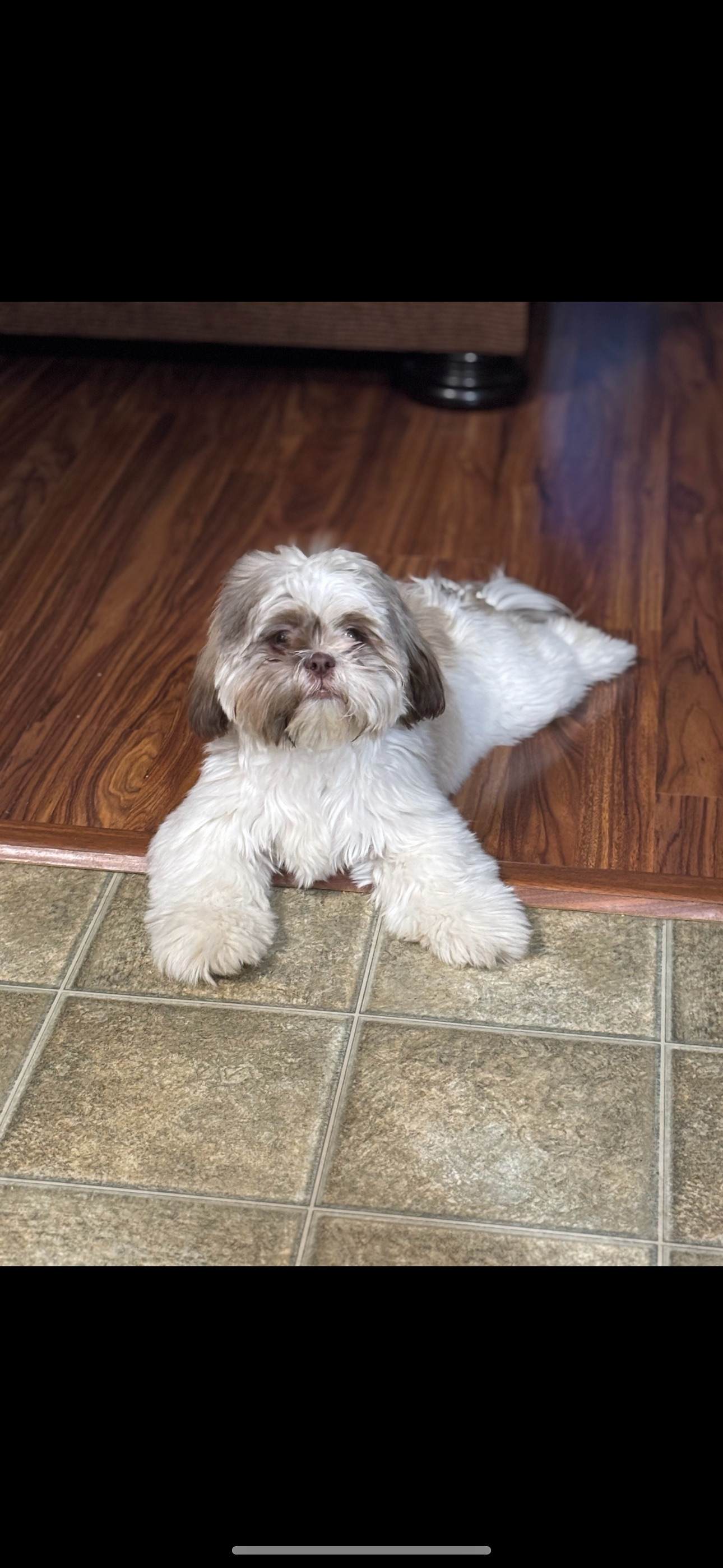 White and tan fluffy Shitzu. Right after midnight he ran away because he got startled by fireworks, we chased him but he was sprinting and got away. His collar came off when we were running after him. He is very friendly and loves people and other dogs.