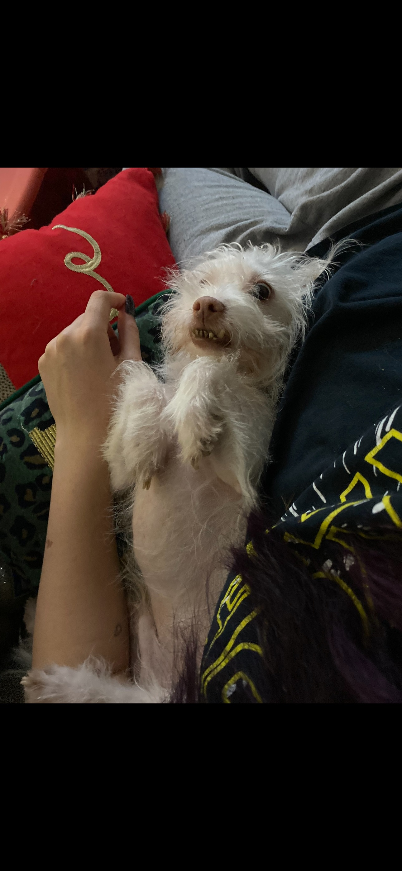 Lippy is a white Maltipoo mix. He is 8 years old, neutered and not chipped. My daughter left the back door open and he went out. He usually comes right back. He was confused and scratched on a neighbors door, they let him in but he panicked and bit their dog (allegedly). They let him out and we searched all night to no avail. He is very sweet but skittish. He is wearing the pink sweater shown in the photo. He is the heart of our family and we just want him back home safe and sound. Please help us. 210-445-4216.