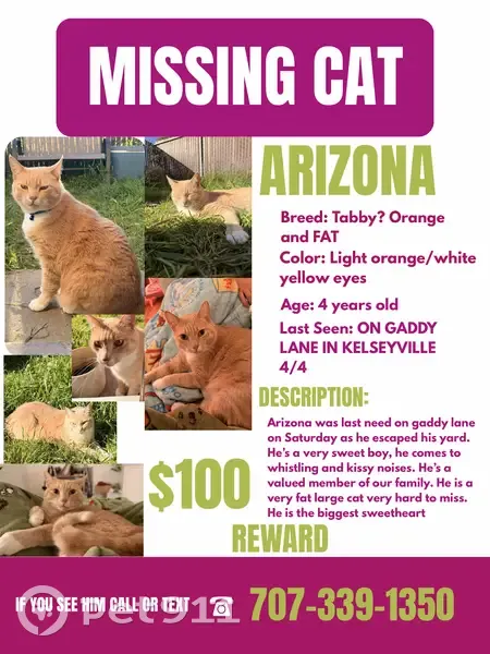 Lost male cat, Kelseyville, San Francisco - orange and white tabby