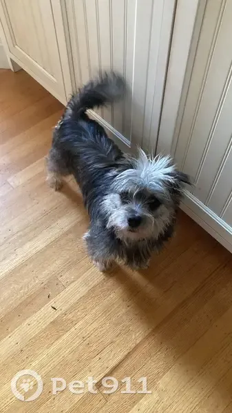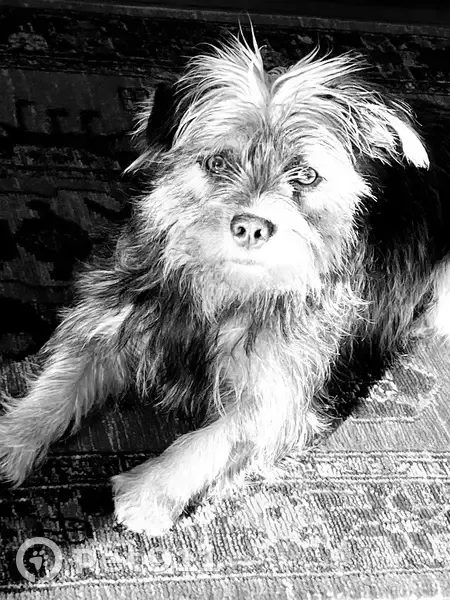 Terrier mix with shades of grey, light brown and white. White hair on top of head and light brown feet, but grey shades on body. Brown eyes. About 15 lbs.