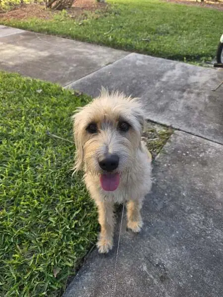 Terrier mix with shades of grey, light brown and white. White hair on top of head and light brown feet, but grey shades on body. Brown eyes. About 15 lbs.