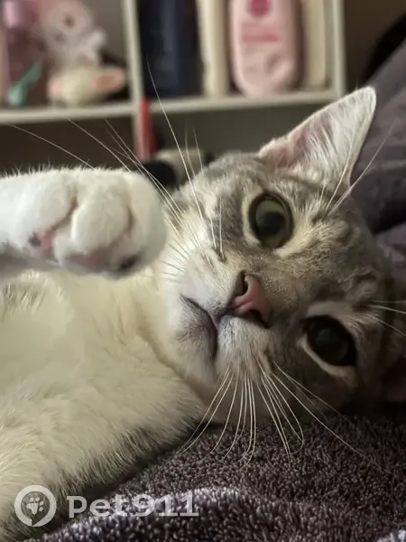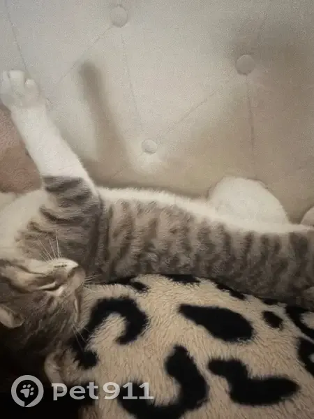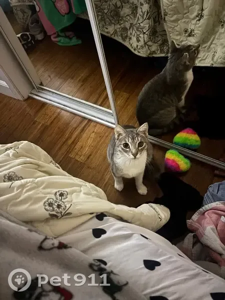 His like a blueish grey tone tiger stripes and white fur. One of his eyes has a cloudy mark. He is very timid, he will not come close and most likely run away. He most likely ran away from the balcony when the door was open. When he is scared he just hides. Please check your balconies to see if he ain’t hiding there. Thank you so much please help me find him.