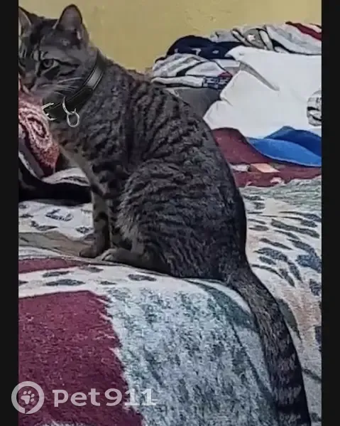 Black collar says kash … green eyes hes a tabby cat