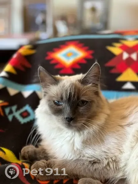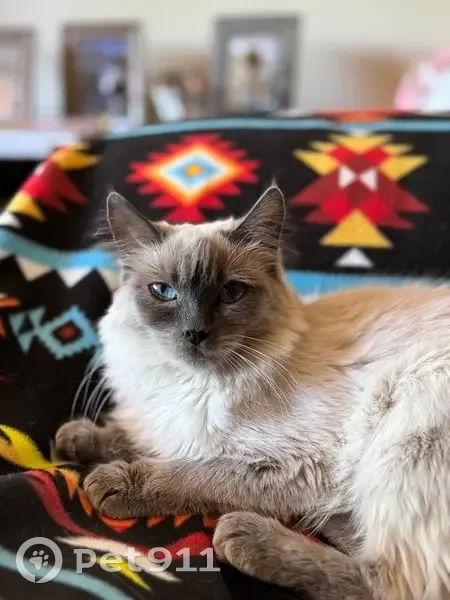She is off-white with a gray face blue eyes gray paws, which is where she got her name mittens she’s extremely skittish so if you do see her, just call me