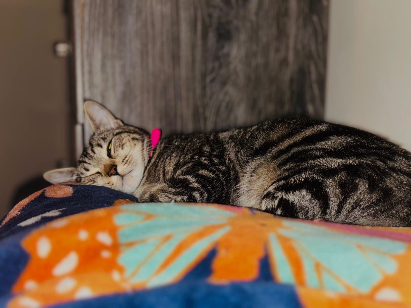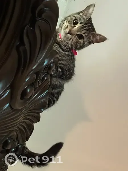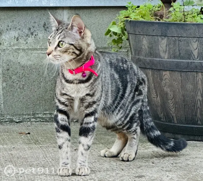 Stormy is a female gray tabby cat with a pink collar. She is very shy and easily scared by loud noises. On December 24, around 9:50 PM, my children opened the door and she went out to the yard. Later, the Christmas noise scared her and she ran away. She went missing near Ferguson Ave, close to the power plant. If seen, please contact us. Thank you.