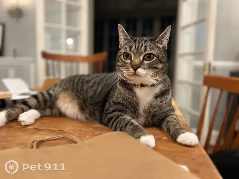 Very timid and scares easily despite his size, he loves food, giant green eyes. He ran out of the back door of the house when we were taking out trash. He is microchipped but has no collar. He’s never been outside before. He has all his shots.
