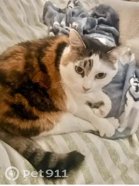November “Nono” has been missing since the afternoon of April 5. She is white with orange and black striped calico on her back with grey stripes over her left eye. She has a gray and black striped tail. She’s strictly an indoor cat and will be very skittish. She actually hates to be picked up. She’s a sweet girl. Please help us get her home.
