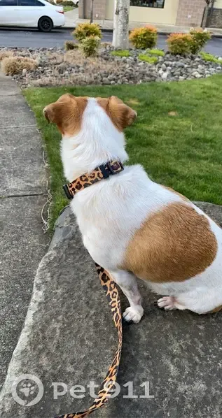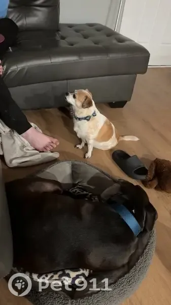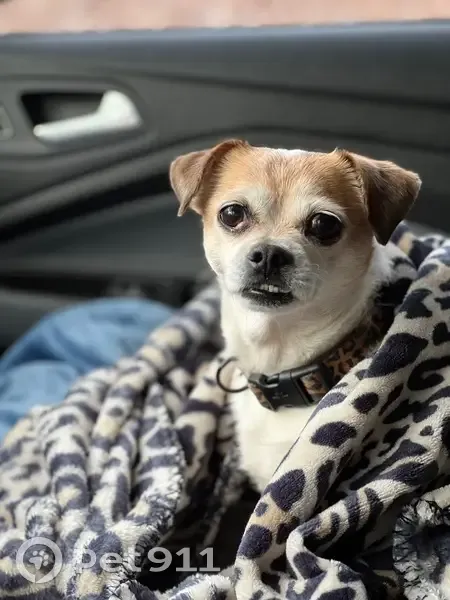 White with large reddish brown spots. Has speckles of light brown as well. She is a chihuahua / pug mix. Has a little snaggle tooth. Wearing a blue green and white simply southern collar with a bow. TREAT MOTIVATED