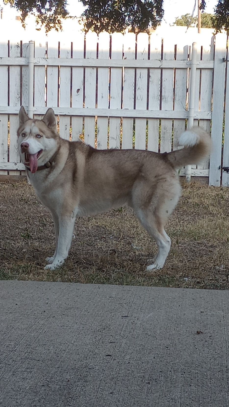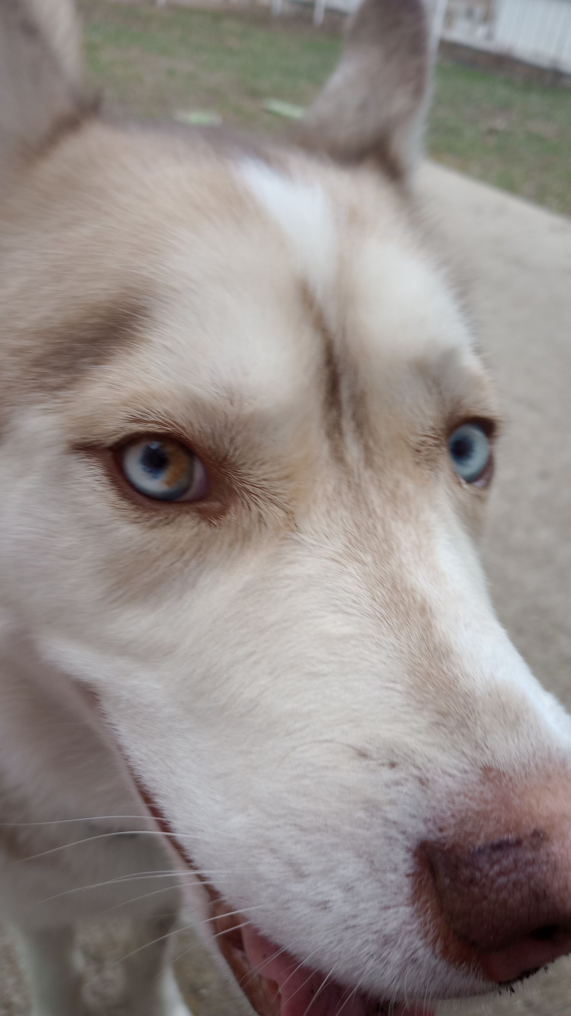 Red and white fur with blue eyes (one has a patch of brown in it) wearing a bright red harness and army green collar with his name on it. He broke off a retractable leash, he's friendly with strangers
