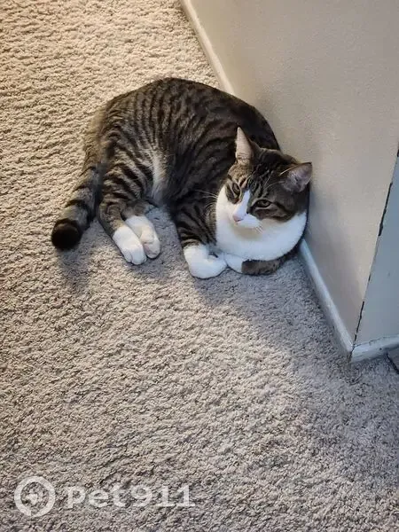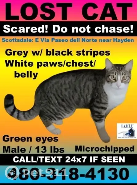 He is gray with black stripes, white on snout, mouth, neck, belly, white socks w/right leg half white, pink nose, green eyes w/one that has a little orange, rings on tail. He ran outside to burn up some extra energy and never came back.