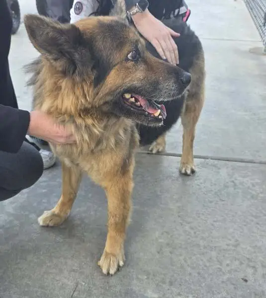 His fur color is light brown with black and his chest is white, he has a spot on his face side (left) he is friendly, he understands Spanish and English