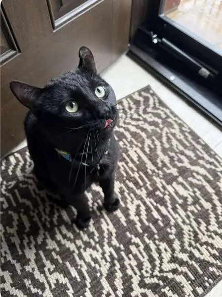 Black cat with yellow eyes, hair missing from ears, and fluffy tail. He has an allergy wound on his neck and opposite side ear with a missing patch of hair. He's vocal and sweet if you're gentle with him. He does use his claws sometimes but only when picked up or playing, & never in a mean or aggressive way. ️$50 REWARD ️