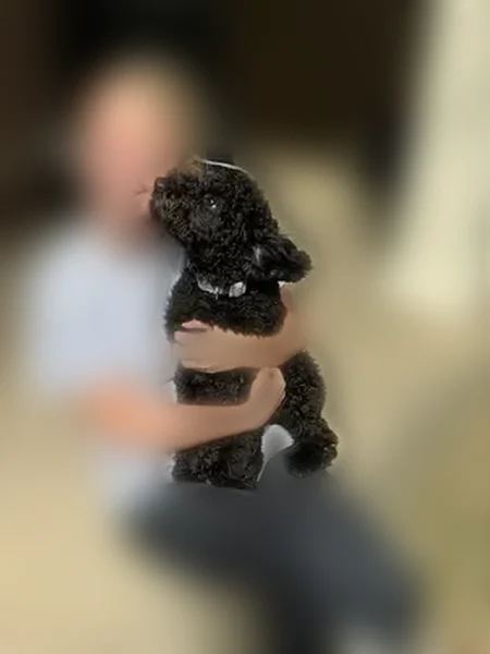 Solid black miniature poodle with denim blue collar. Shy. Weighs about 15 pounds and is about knee high tall.