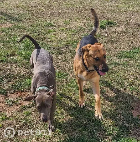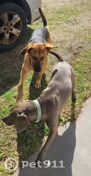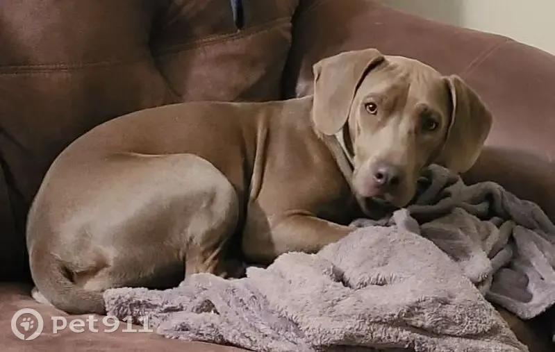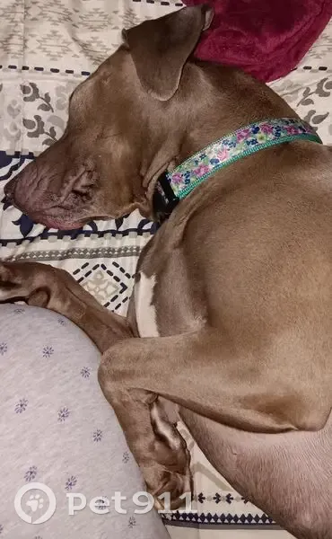 Silver short haired. Looks like a weimaraner. Just smaller statue. She's very friendly, loves people. She is chipped, has a tattoo on her stomach and she is fixed.